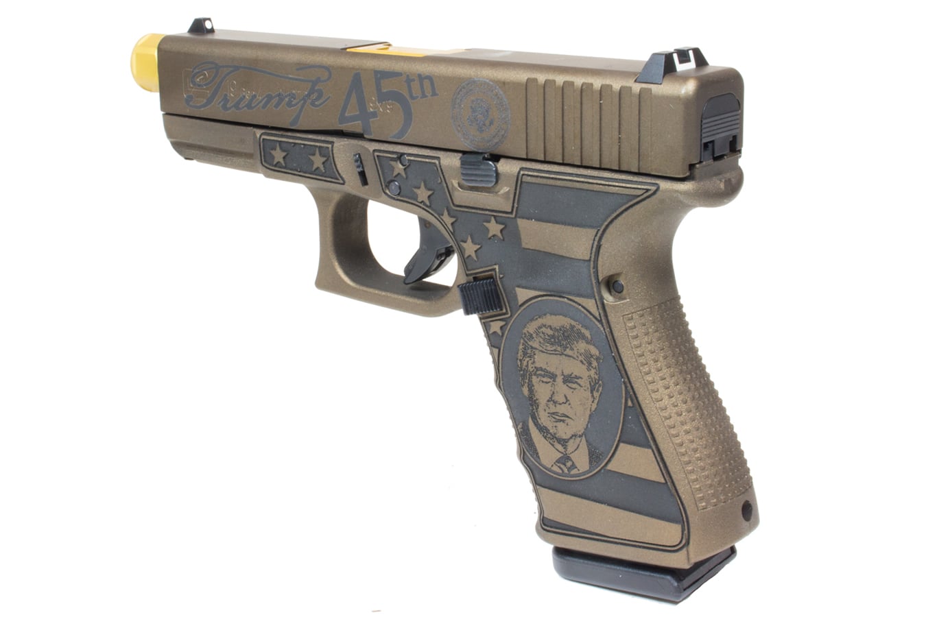 The Glock G19 9mm Trump Edition Gen 4 US Made Handgun UG1950203 is chambered in 9mm, offering an excellent balance of stopping power, capacity, and manageable recoil.